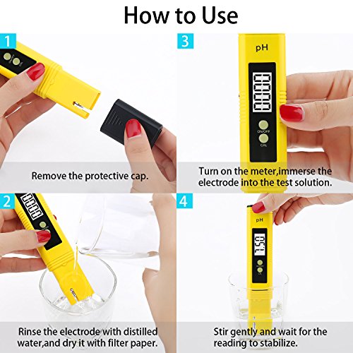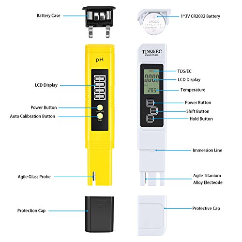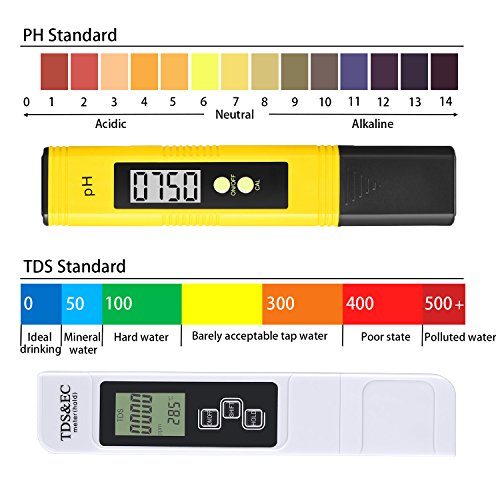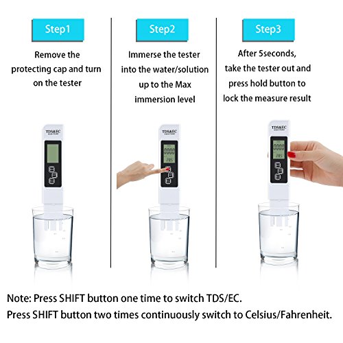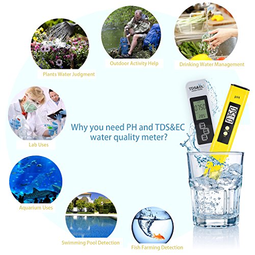 -. Feature : SIMPLE OPERATION & FAST RESULTS: Just turn it on, dip in liquid and read display, no need to work with color charts or test strips. Just 3-5 seconds to know the water quality, large digital display makes it easy to read, fast and accurate. / ACCURATE MEASUREMENT : Minimum resolution 0.01. Accuracy:±2%. Test data is the same size as big brand in the market . PH: 0-14, Conductivity: 0 - 9990 µs/cm, TDS: 0 - 9990 ppm (parts per million), Degrees Celsius: 0.1 - 80.0°C, Fahrenheit: 32.0 - 176.0°F, can be used in water purifiers and filters, food (vegetable, fruits) & drink quality monitoring, pools and spas, aquariums, hydroponics etc. / UTO-OFF FUNCTION : The water quality measurement meter would turn off automatically after 5 minutes of non-use to conserve batteries. / POCKET SIZE & LIGHTWEIGHT: Our TDS EC Temperature PH water quality meter tester kit is smart design, small size and lightweight, can be used and carried everywhere with ease, After use, put them in their case to keep them clean and safe. / 100% SATISFACTION GUARANTEED: We are confident at our products, so we promise 30-DAY MONEY REFUND guarantee & ONE YEAR REPLACEMENT warranty. Of course, we also provide friendly customer service, please feel free to contact for any demands.