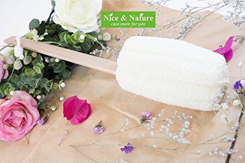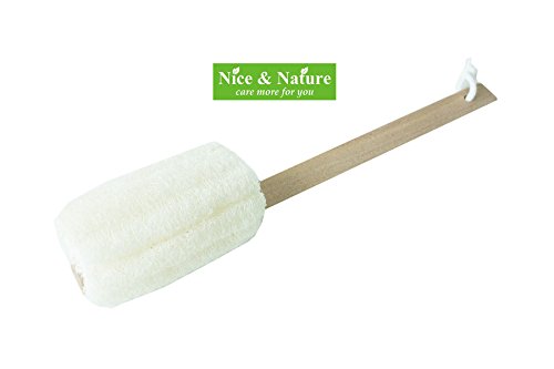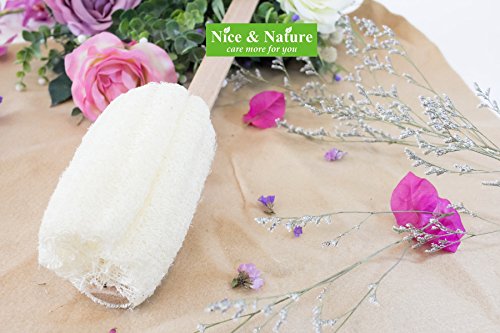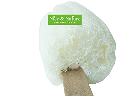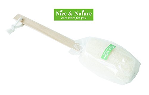 - 16” in length, wooden Handle. Loofah Size 3"x5". Easy to Hang. Great for use with soap. Loofah soften when wet. Long wooden handle lets you easily exfoliate the back, legs, feet & everywhere else. 100% natural loofah and finished with a hanger loop for quick drying