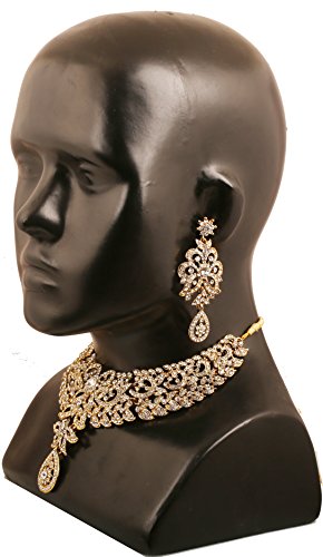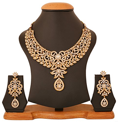 Alloy metal, white tone, contemporary semi bridal necklace set with rhinestones. For Perfect Matching, search for TOUCHSTONE BANGLES.