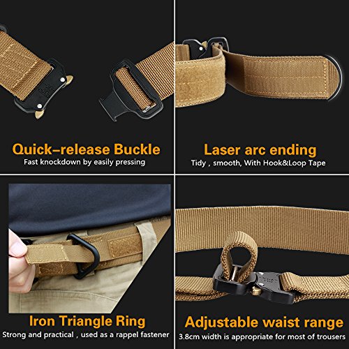 -. Feature : 1.MATERIAL:Made by high quality CORDURA material, breathable, comfortable for daily use. / 2.FEATURES: a)The belt is designed to worn with most casual or tactical pants. extremely durable so that is able to withstand extreme environmental conditions and support multiple activities. Exquisite, strong, metal buckle. b)Fully adjustable for precise fit and secured with hook and loop end that provides great security. Your tactical belt will no longer loosen up by itself. c)Intuitive and smooth quick release functionality when you push the golden tabs down. / 3.SPECIFICATION: a) Weight:0.55lbs. b) Colors available: Foliage Green, Black, Coyote Brown. c) Waist size: 35.8~39.7inch Belt width: 1.75inch /4.4cm / 4. USAGE: Perfect for airsoft, paintball, hunting, shooting, wargame, training... / 5.PACKAGE INCLUDES: Belt x 1