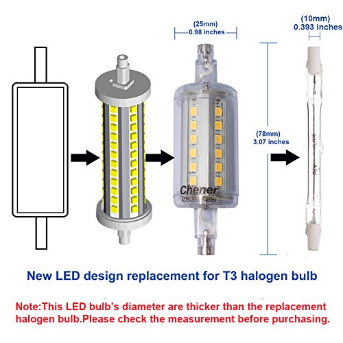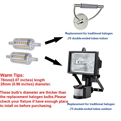 - 2 Pcs 5Watt R7s base J-Type linear LED halogen/incandescent replacement bulb; 78mm (3.07'') length,25mm (0.98 inches) diameter.These bulb’s diameter are thicker than the replacement halogen bulbs.Please check your fixture if have enough place to intall on before purchasing.