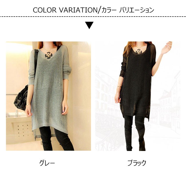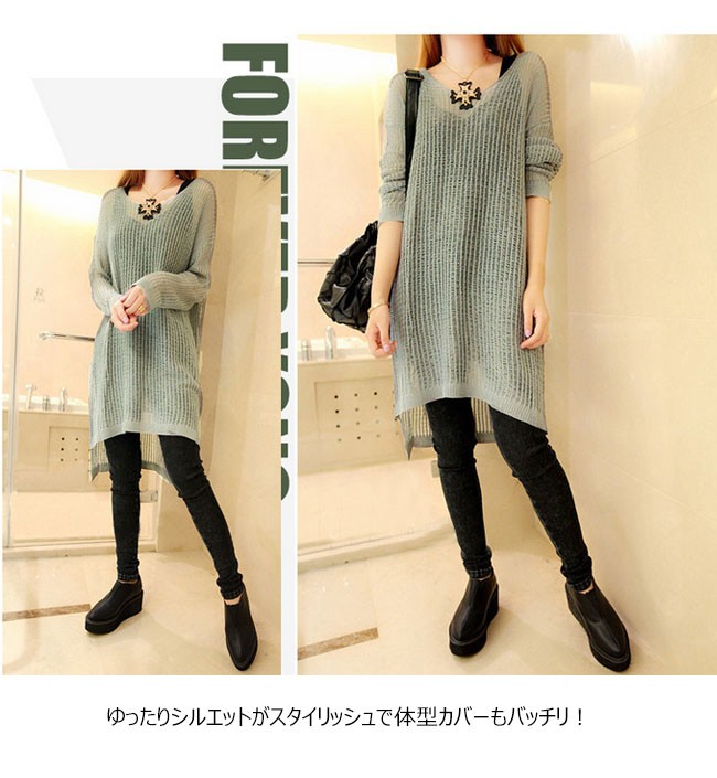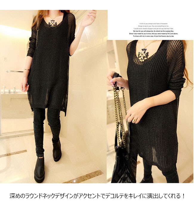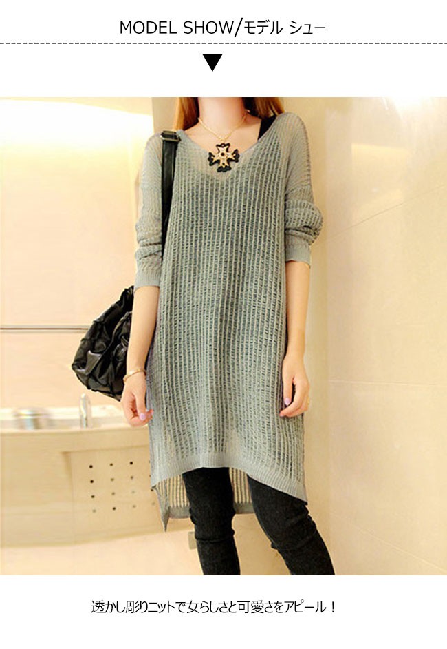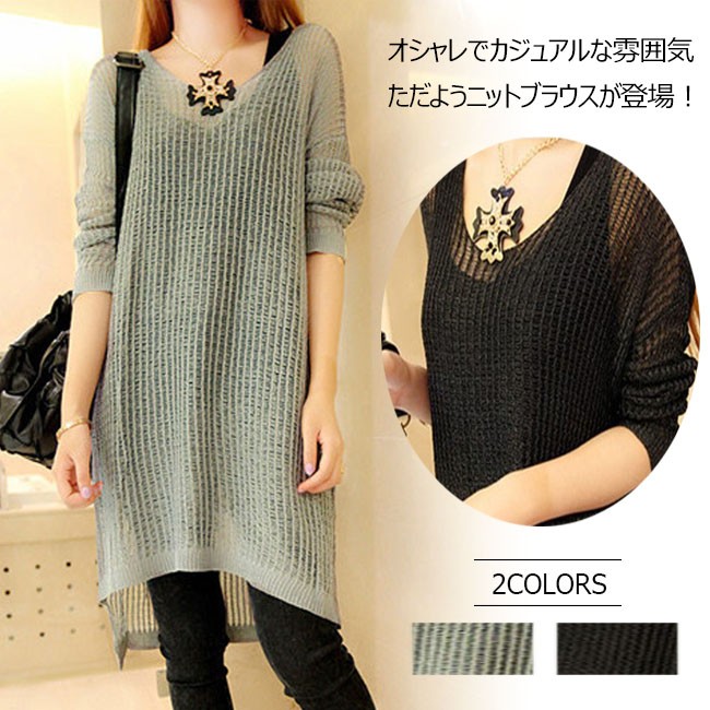 | 商品名 | ニットブラウス ニットシャツ ロングブラウス レディース 透け感 ゆったり ラウンドネック 長袖 薄手 カジュアル 膝丈 2017秋新作 |