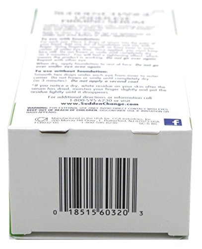 Sudden Change Under-Eye Firming Serum works on unsightly wrinkles and bags that can form under your eyes. The Under Eye Serum, 0.23 oz, can be used with or without your foundation to lift, tighten and smooth out under-eye problems. This dark circles serum offers you a non-surgical under-eye "lift" when you need it in the daytime or evening to give you a smooth, younger looking appearance. With the Sudden Change Under-Eye Firming Serum, the lines, wrinkles, dark circles and puffiness under your eyes will be visibly reduced in just three minutes.Feature