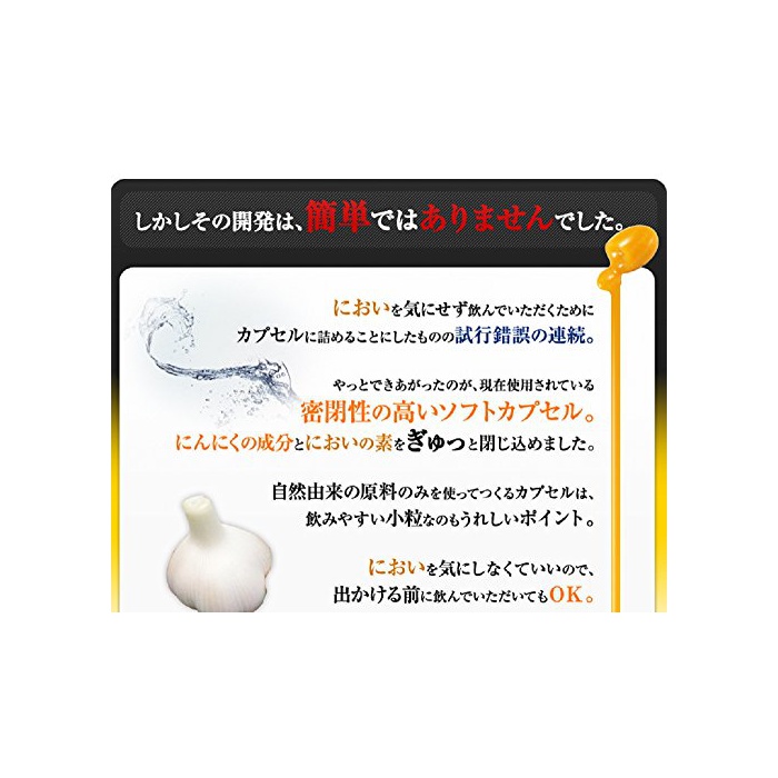 「마늘 계란 노른자」서는,옛날부터 계승되어 왔다”건강의 원”입니다.단지,아무리 해도 냄새나지만 강한 모아 두고, 시대와 함께 잊혀지고 있던 것입니다.야즈야는,이「마늘 계란 노른자」것으로(에) 조카를 신경쓰지 않고 삼킬 수 있는 바와 같이(하도록) 소프트 캡슐에 분명히 했습니다.