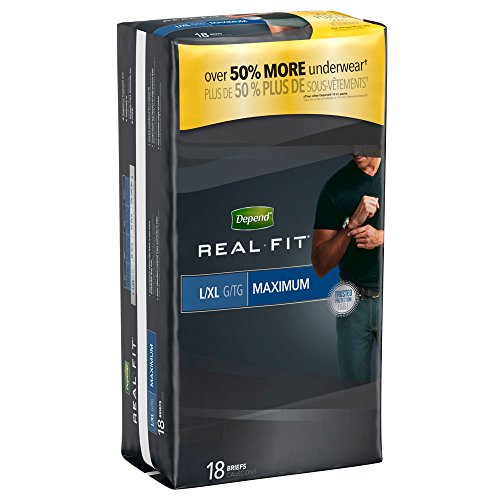 -. Binding : Health and Beauty -. Brand : Depend -. Color : gray -. EAN : 0036000339925 -. Feature : Gentle elastic leg gathers help provide a close fit for better protection. / Unique DEPEND® protection system with Ultra ABSORB-LOC® quickly absorbs and locks fluid inside away from clothes as it neutralizes odor. / Breathable stretch panels gently contour to your body for a close, comfortable fit. / Latex-free elastic design allows you to pull them on and off just like regular underwear. / Fits Waists 38 to 50 in. Colored bar/tag in waistband indicates back of item. -. IsAdultProduct : 0 -. Label : Kimberly-Clark -. Manufacturer : Kimberly-Clark -. Model : 33992 -. MPN : 33992 -. NumberOfItems : 1 -. PackageQuantity : 1 -. PartNumber : 33992 -. ProductGroup : Health and Beauty -. ProductTypeName : HEALTH_PERSONAL_CARE -. Publisher : Kimberly-Clark -. Size : Large/XL -. Studio : Kimberly-Clark -. Title : Depend Real Fit for Men Briefs, Large/XL, Pack/18 -. UPC : 036000339925
