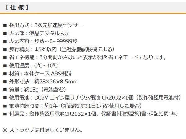 fk094igrjs3Dセンサー搭載設定不要ですぐに使用できる歩数計です サイズ 個装サイズ:9×16×1cm 重量 個装重量:21g 生産国 中国 大画面で見やすい歩数計 3Dセンサー搭載設定不要ですぐに使用できる歩数計です