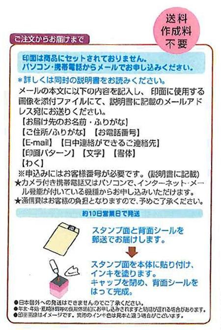 | 印面は商品にセットされていないので、商品到着後に、印面部をメールでお申し込みください。子供やペット、思い出の写真まで何でもスタンプにできちゃいます。プレゼントにも最適! |