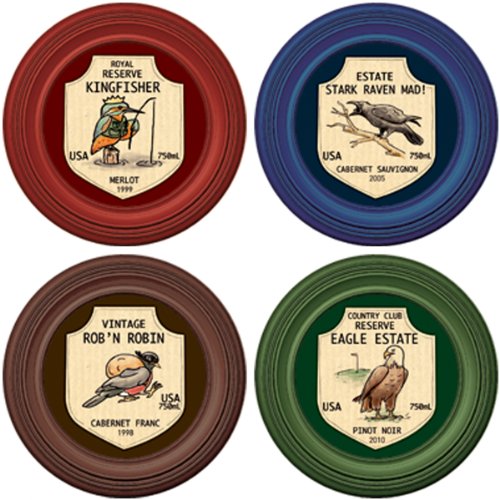 - Bottle Birds design with birdthemed wine labels on assorted red, blue, brown and green coasters
