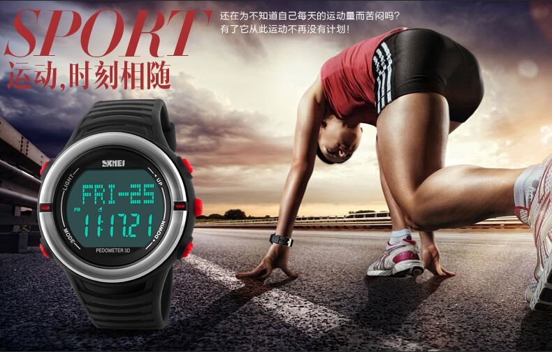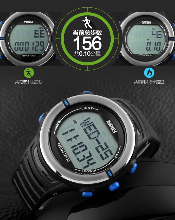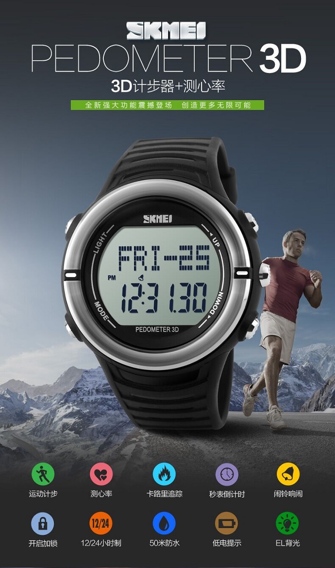 | Many Function Jam tangan SKMEI memiliki fungsi seperti penunjuk hari dan bulan、 pedometer、 heartrate monitor、 waterproof dan stopwatch.