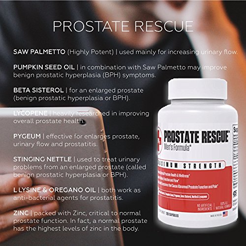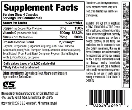 Studio : C S Nutrition LLC Publisher : C S Nutrition LLC Binding : Health and Beauty Product Description Your prostate health could be affecting the quality of your lifeIt takes no time for age impact your urinary flow, drive, energy, vitality overall prostate health. As many men start developing prostate problems from the age of about 40, their energy levels drop. If you suffer from pain, burning, frequent urination, waking up in the night, unable to empty your bladder, prostatitis, then we've got you covered with PROSTATE RESCUE to help restore your prostate health naturally. This prostate formula uses 10 ingredients that work together extremely well. SAW PALMETTO (Highly Potent)Saw palmetto?is used mainly for increasing urinary flow. BETA SISTEROL Beta Sisterol is for an enlarged?prostate?(benign prostatic hyperplasia or BPH). PUMPKIN SEED OilPumpkin Seed Oil in combination with Saw Palmetto may improve benign prostatic hyperplasia (BPH) symptoms. LYCOPENE Lycopene has been heavily researched in improving overall prostate health. PYGEUMPygeum is effective for enlarges prostate, urinary flow and prostatitis. STINGING NETTLE Stinging Nettle is used to treat urinary problems from an enlarged?prostate?(called benign prostatic hyperplasia or BPH). L LYSINE and OREGANO OILL Lysine and Oregano Oil both work as anti-bacterial agents for prostatitis. ZincProstate Rescue is packed with Zinc. Zinc is critical to normal?prostate function. In fact, a normal?prostate?has the highest levels of zinc in the body. 0