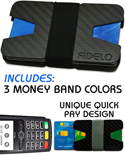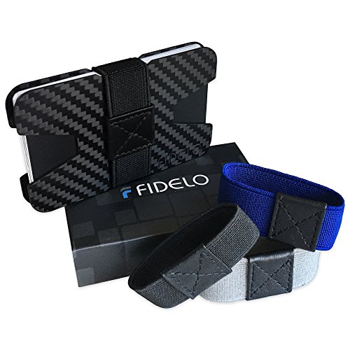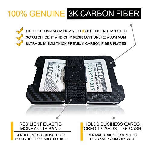 -. Feature : 3 MONEY BAND COLORS & HOLDS UP TO 20 CARDS: Our FIDELO wallets for men come with 3 stylish colored bands: MIDNIGHT BLACK, CHARCOAL GREY and SMOKE GREY to compliment any style. The elastic and leather used in our money clip band is durable and resilient allowing you to carry up to 20 cards and cash as well. / MODERN DESIGN & EASY CARD ACCESS: Constructed from Premium Quality Carbon Fiber, this product has a modern sleek look, smooth polished edges and will last you a lifetime. The unique push & pull access points eliminate the frustration of difficult card retrieval experienced with many other minimalist wallets. / ULTRA SLIM, SUPER STRONG & LIGHT WEIGHT: FIDELO minimalist wallets are slim, durable and light allowing users to carry their ID and payment cards in style while eliminating that giant back pocket wallet bulge. / PURCHASE RISK FREE: If you're not completely satisfied with you purchase, then neither are we! All FIDELO products are backed by a 100% SATISFACTION GUARANTEE. No matter how big or small, if you have any issue we will fix it. Simply contact us and our support team will make it right. Your purchase is also protected by a 30 DAY, no questions asked, money back guarantee as well! / AWESOME GIFT IDEA: FIDELO wallets make the best gifts for men who have everything and think they need nothing. If you're looking for a unique Christmas, birthday or just because gift, look no further and surP.R.Ise them with one of our stylish carbon fiber wallets.