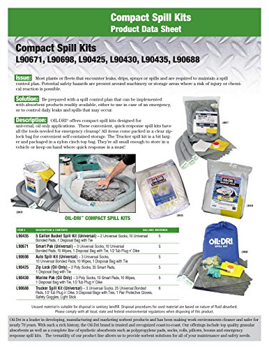 Universal spill kit provides two absorbent socks, 15 absorbent pads, an LDPE disposal bag, and a pail for use in the containment, cleanup, and disposal of water-based and oil-based nonacid liquids on land; 5-gallon maximum absorption capacity
