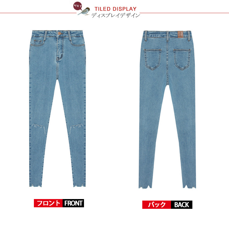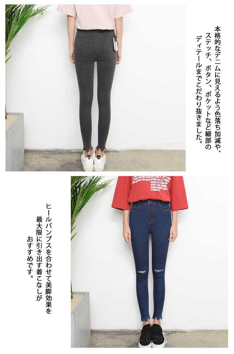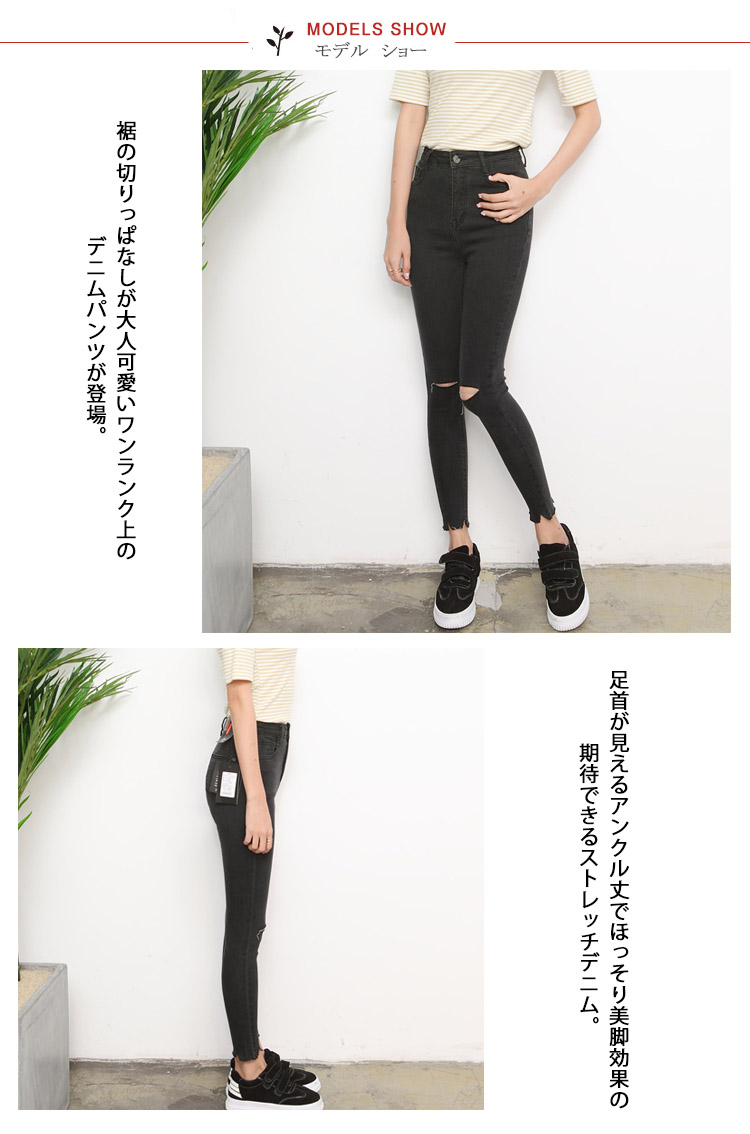 | 裾の切りっぱなしが大人可愛いワンランク上のデニムパンツが登場。足首が見えるアンクル丈でほっそり美脚効果の期待できるストレッチデニム。程度良いストレッチの効いた生地は脚をキュッと引き締め、細く、長く見せてくれる効果も◎本格的なデニムに見えるよう色落ち加減や、ステッチ、ボタン、ポケットなど細部のディテールまでこだわり抜きました。ヒールパンプスを合わせて美脚効果を最大限に引き出す着こなしがおすすめです。 | |