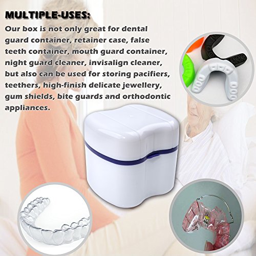 【MULTIPLE-USES】Shaped 3.35" X 3" X 3.10" inch, the tub is 2" deep, our box is not only great for dental guard container, retainer case, false teeth container, mouth guard container, night guard cleaner, invisalign cleaner, but also can be used for storing pacifiers, teethers, high-finish delicate jewellery, gum shields, bite guards and orthodontic appliances. The product is an incredible gift for elderly people in the family, toddlers, or for any travelers as a solid denture cup storage box.