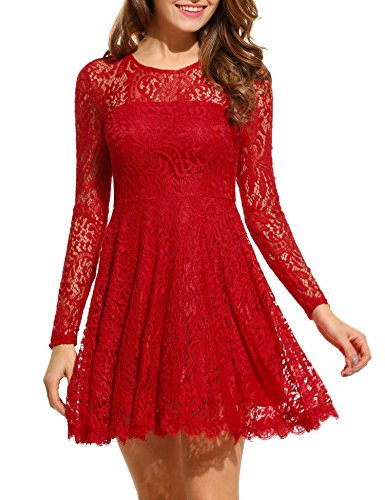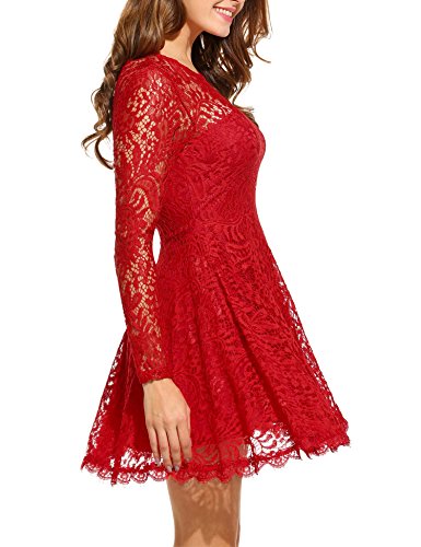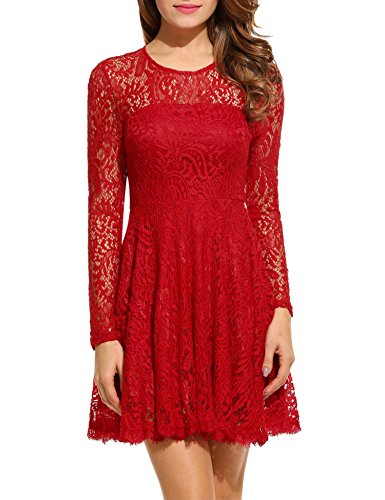 Long sleeve o-neck lace swing dress with eyelash brim backless design, easy to show your curve and make you elegant