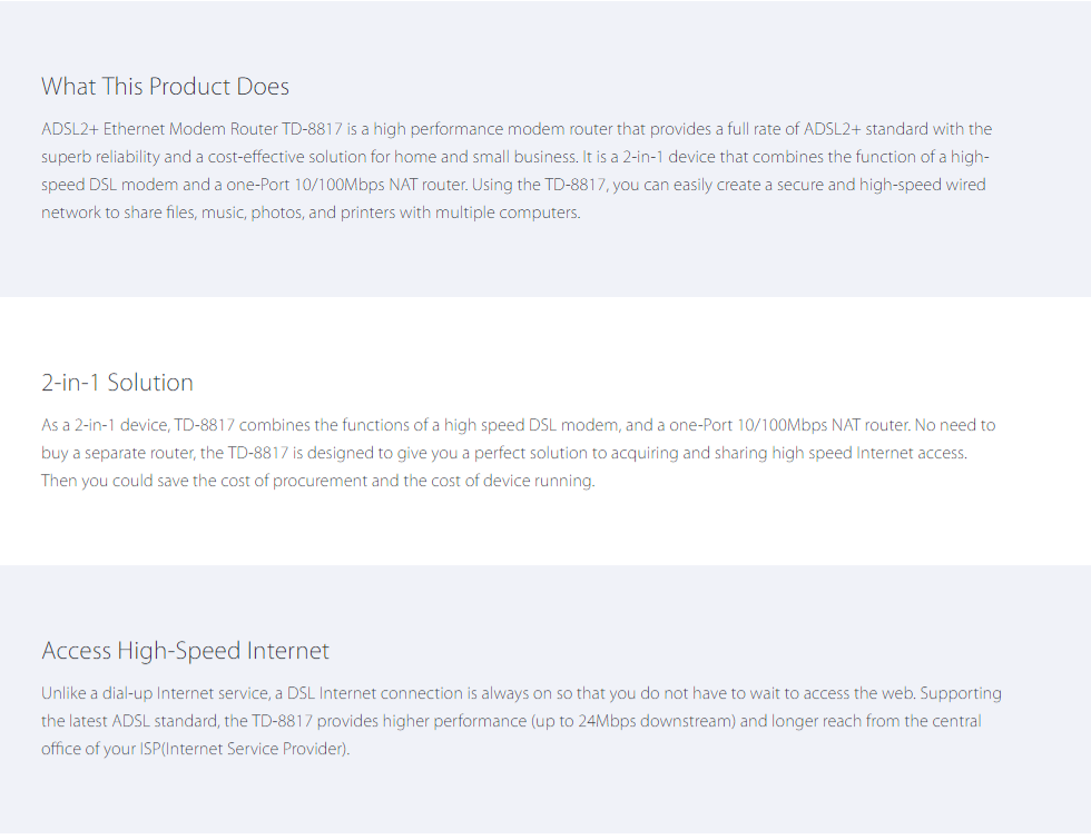 • Works with the latest ADSL standards: up to 24Mbps downstream superior performance