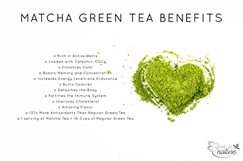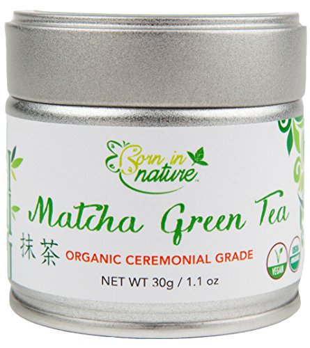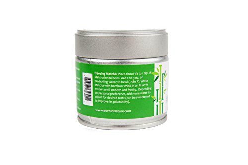 -. Binding : Misc. -. Brand : Born In Nature -. Color : Green -. EAN : 0603281343011 -. Feature : 137 x MORE ANTIOXIDANTS THAN REGULAR GREEN TEA: Our Matcha contains high antioxidants compared to all known natural fruits and vegetables known thus far. ORAC test results prove that one gram of ceremonial matcha green tea contains 1384 ORAC units. When compared to other antioxidant rich fruits and vegetables as well as other leading superfoods, Born In Nature's ceremonial matcha green tea clearly stands out above the rest. / SUPERIOR QUALITY MATCHA: Matcha is extremely rich in 3 very important nutrients that are of high interest for healthier lifestyle living: Antioxidants, L-Theanine (Amino acids), and Insoluble Fiber (100% benefits from eating whole leaf). Our Matcha drinkers receive the full nutrition of the whole tea leaf and will enjoy the high concentration of green tea antioxidants, amino acids, vitamins, minerals and fiber. / HIGHEST CEREMONIAL QUALITY: The quality of Matcha tea depends almost completely on the quality of the original tea, of Tencha. Matcha is sweet and smooth with just a hint of astringency. The sweetness comes from the naturally occurring L-Theanine amino acids and plant fibers. With its high concentration of L-Theanine amino acids, Matcha provides most consumers with a delicate energy boost lasting from 3 to 6 hours. Our Matcha Tea helps burns more calories! / USDA CERTIFIED ORGANIC MATCHA TEA: Certified Organic by QAI in Japan - Only a few dozen tea farmers in all of Japan own the extensive knowledge required to produce this organic tea. The most important tea growing area for our organic tea is the tea area in Toyota which is next to Nishio city. The region is located at 600m sea level, with a cooler climate than Nishio. The lower temperature is a natural barrier and protects the organic fields. Important since organic production does not use any pesticides and relies on natural fertilizer only. / LIFETIME 100% SATISFACTION GUARANTEED - Our Matcha is Grown and Imported from Japan. Japan prides itself to produce the world's best and most premium green teas. The typical flavor of Japanese teas is the fresh, intense green flavor. If you are not COMPLETELY happy with your organic Matcha Powder we offer YOUR MONEY BACK! No Questions Asked. Don't wait any longer, Try this "lift-the-spirit" drink NOW! -. LegalDisclaimer : Any health benefits, claims, or statements have not been evaluated by the Food and Drug Administration. This product is not intended to diagnose, treat, cure, or prevent any disease.Actual product packaging and materials may contain more and different information than what is shown on our website. We recommend that you do not rely solely on the information presented and that you always read labels, warnings, and directions before using or consuming a product. Please see our full disclaimer below. -. NumberOfItems : 1 -. PackageQuantity : 1 -. ProductGroup : Grocery -. ProductTypeName : GROCERY -. Size : 2.10 x 2.30 x 2.30 inches -. Title : MATCHA GREEN TEA Powder By Born In Nature 30g Tin - Premium Japanese Ceremonial Grade - USDA Certified Organic and Vegan - Superfood for Energy, Focus & Weigh Loss - High in Antioxidants - Great Taste -. UPC : 603281343011