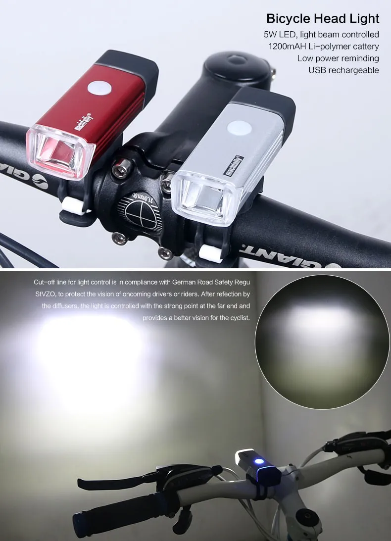 5W Bicycle Front Light USB Rechargeable High Power LED Head Lamp Handlebar Lighting Lantern Bike Cycling Flashlight 1200mAH