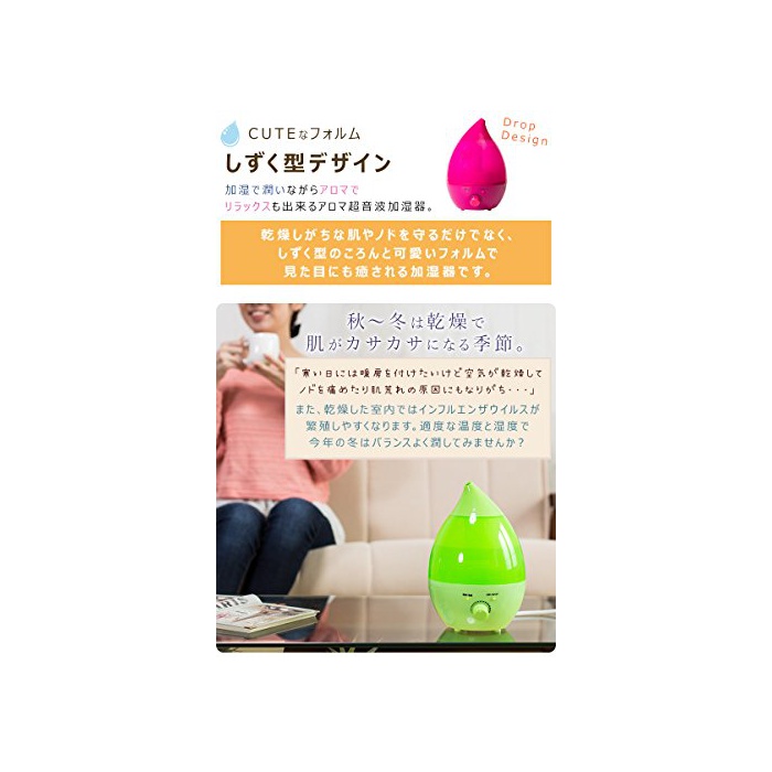 【비고】가습방식:초음파 진동가 습방식 수 탱크 용량:약1.3L전원:PSE플러그 소비전력:AC100V20W가 습능력:최대220ml/H 약5~6시간 연속 운전 가능 코드 길이:약106cm※아로마 오일 사용상의 주의 아로마 오일은 아로마 쟁반에 수물방울 늘어뜨려 하십시오.