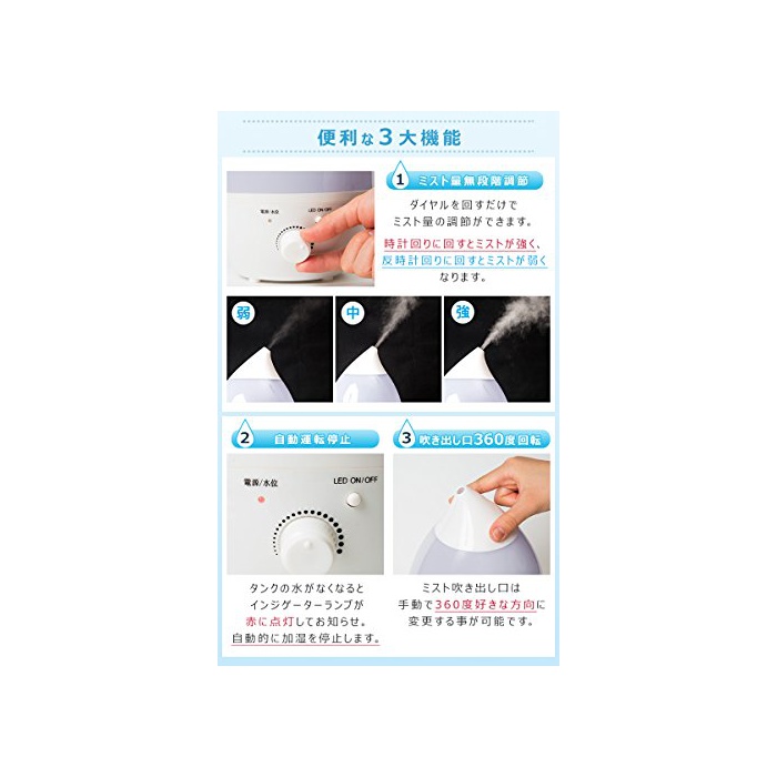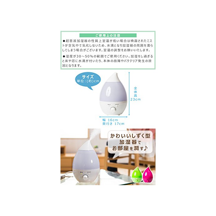 생산지:수입품 비고: ※완성품입니다. 가습방식:초음파 진동가 습방식 수 탱크 용량:약1.1L 재질:ABS수지/PP 전원:PSE플러그 소비전력:AC 100V 16W 가습능력:120ml/h 코드 길이:약106cm ※아로마 오일 사용상의 주의 아로마 오일은 아로마 쟁반에 수물방울 늘어뜨려 하십시오.