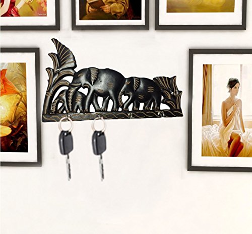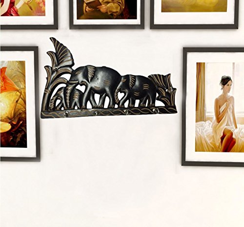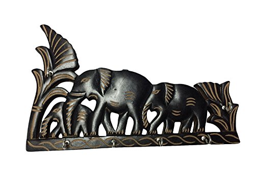 Valentines Present, Handmade 10" Wooden Key Holder with 6 Key Hooks for Home Office Interior Décor Material Black Colored Elephant Design, Wall Key Organizer, Wall Mounted Key Hooks