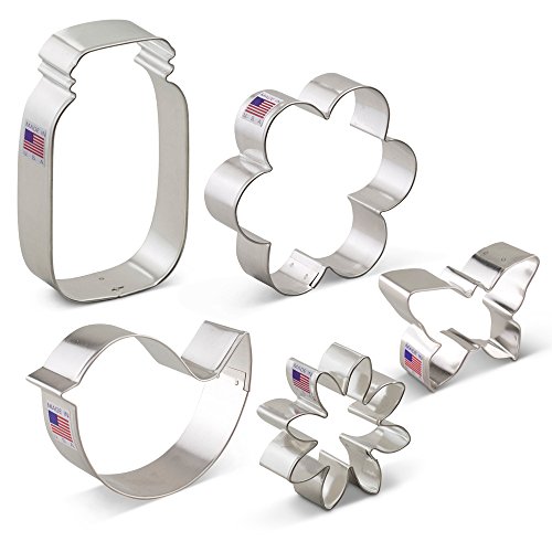 Flower Garden Cookie Cutters - 5 Piece Boxed Set - Daisy, Flower, Teardrop Bird, Butterfly, Mason Jar - Ann Clark - US Tin Plated Steel