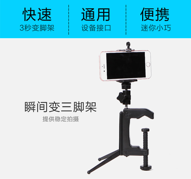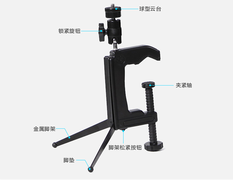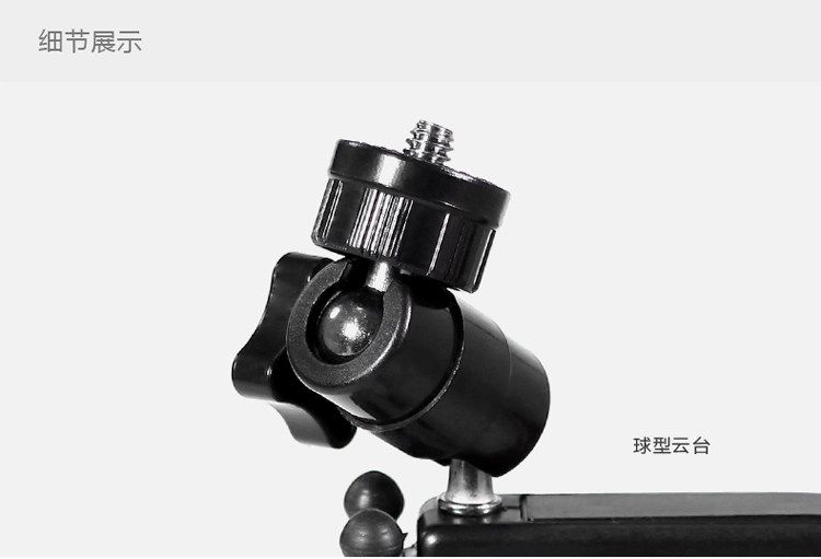 Can be clipped to the chair back, bookcase wall, very convenient. Two sections of Yuntai facilitate you to adjust the shooting angle, macro photography indispensable! Plastic material.