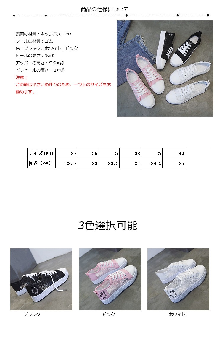 商品番号:XZ010材質:キャンパス+ゴム色:ブラック、ホワイト、ピンクヒールの高さ:3cm約 インヒールの高さ:1cm約 アッパーの高さ:5cm約サイズについてEU36=23cm EU37=23.5cm EU38=24cm EU39=24.5cm EU40=25cm注意:※ サイズなど、商品詳細を必ずご確認後、ご了承頂いた上でご購入をお願いします。また、採寸方法違いにより、0.5~1cmの誤差がございますので、ご了承ください。商品内容:1xスニーカー特徴:【軽量、通気性よい】ゴムのソールとキャンパスの材質でスポーツシューズならではの軽さを実現し、通気性もよいです。どんな季節でも着用します。 軽量なので、ランニングや歩くや他の運動が易くになりました。【ファッションな配色】ファッションな配色で、シューズがファッションになり、女性に最適です。中学生などに通学靴としてもよい選択です。 【ゴムのソール耐滑】柔らかい材質で作って、ゴムのソールので、耐滑のです。スムーズな足運びをサポートします。球技や他の運動にもスムーズになりました。【利用場合】スポーツだけでなく、通勤や通学やアウトドア、普段履きとしても カジュアルなコーディネートをお楽しみい ただけます。