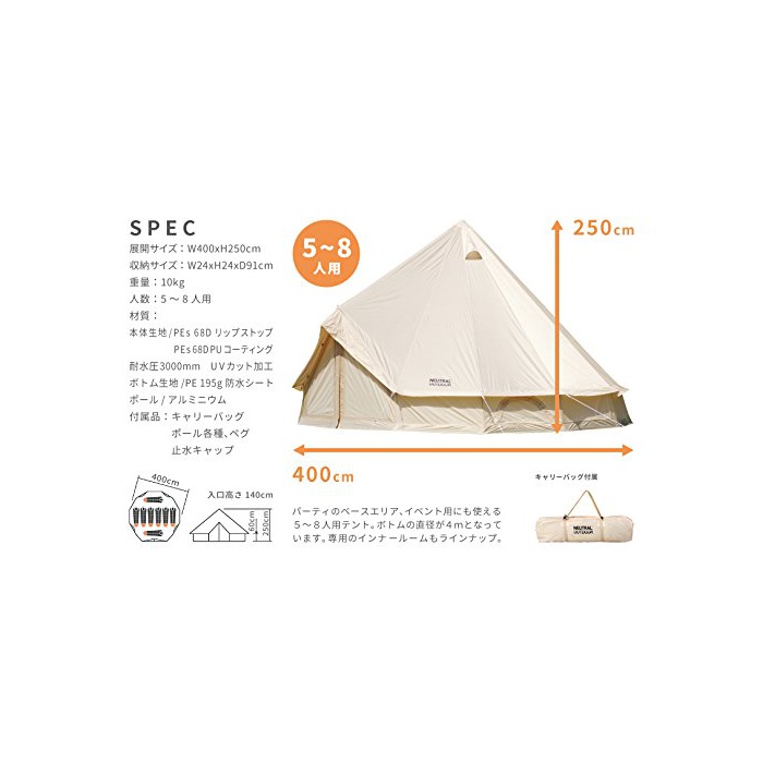 원본상품명: NEUTRAL OUTDOOR(ニュトラルアウトドア) ワンポルテント NT-TE03 GE テント4mベジュ 58人 納袋付き 23458