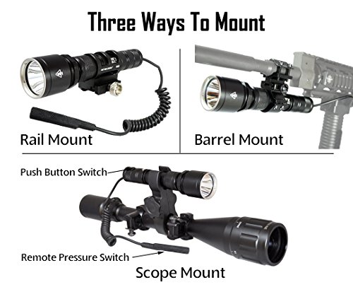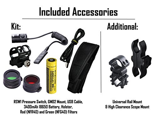 COMPLETE HUNTING KIT - Comes with a Nitecore 40mm Red and Green Filters for hunting and tactical purposes, an RSW1 Pressure Switch and three mounting options - a GM02 mount, barrel mount, or high clearance scope mount from LumenTac to easily attach to your rifle. Perfect for hog or coyote hunting