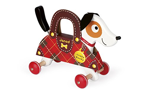 Janod Crazy Rocky pull toy is bound to be your child's next best friend! It's so cute and can go anywhere with you when you pull Rocky by the string. Solid wood construction, the panel design lets it twist and turn with your child. Featuring rubber lined wheels and spring loaded tail which moves as he walks. Floppy velvet ears add to his appeal. Recommended for children aged 12-36 months.