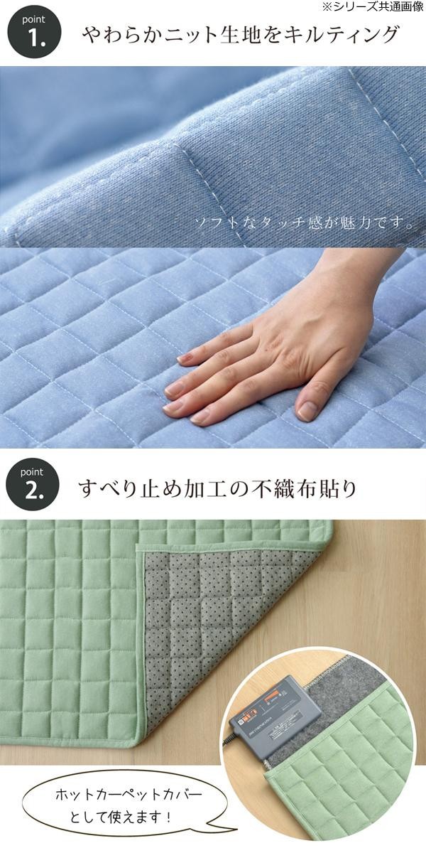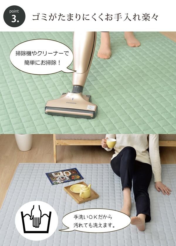 キルティングラグカーペットです。キルティング加工をすることで、中わたが寄ったりズレたりしにくくなります。中材には固わたを使用しており、適度なクッション性があります。フローリングを傷つけにくいよう、裏には不織布を貼っています。 |
