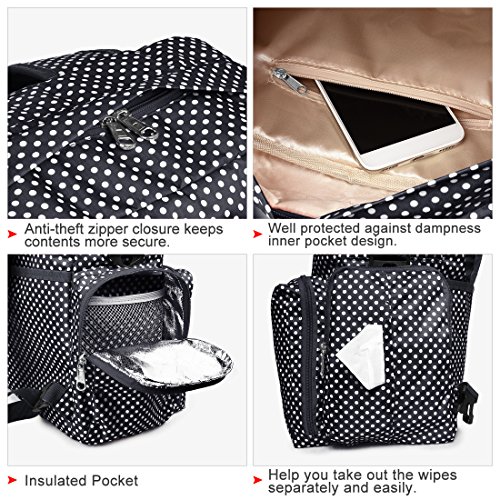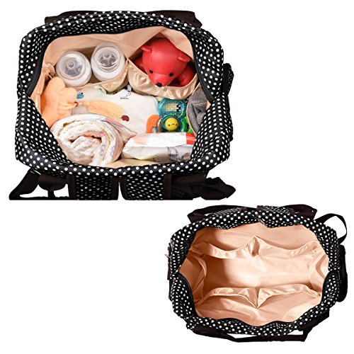 ♥LARGE CAPACITY & STURDY BASE: Size: 13.4" X 13.4" X 4.7", 14 Pockets. Up to 22L capacity.Stand on its own.1 secure anti-theft zipper closure main compartment with 13 compartments for keeping messy things (snacks,baby cloth,diapers,etc) neatly and orderly.1 side wipes dispenser for easy access to tissues and wipes. Insulated pocket fits full size (8oz) bottle. Big enough for more than one child.