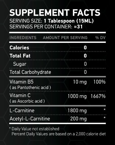 -. Feature : 0 Calories - 0 Fat - 0 Carbohydrates - 0 Sugar / 1800mg of L-Carnitine PLUS 200mg of Acetyl L-Carnitine / Vitamin B5 10mg 100% - Vitamin C 1000mg 1667% / Delicious Taste - 31 Servings / NO ASPARTAME - NO ARTIFICIAL COLORS
