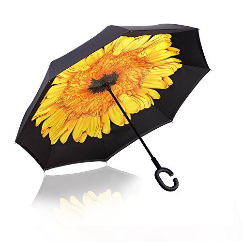 -. Feature : DURABLE MATERIALS - Made of water repellent pongee fabric, breathable double layer canopy and smooth top, using high-quality electroplated steel shaft and premium resin-reinforced fiberglass ribs. / DOUBLE LAYER DESIGN - Innovative design allows you to close the reverse folding umbrella and put it directly anywhere in a car or a room without making the seat or floor wet, and even other people standing beside you on a bus or subway will not get wet, either. / 100% LIFETIME GUARANTEE - This Inverted Umbrella is made to last. If you have any problems, at any point, you can return it to us for replacement or a full refund. That means you can try it at absolutely no risk to you. / HANDS FREE HANDLE - The C Hook Handle allows you to play with mobile phones when you hold the reversible umbrella with your wrist and lift a bag in the rain, also convenient for mothers to hold the inverted umbrella when they have a baby in arms. / STAND UP ON ITS OWN - Perfect design allows it to stand up totally on its own when closed without being held tight by the velcro close strap, which saves much space.