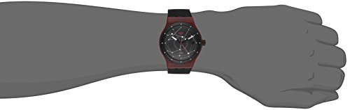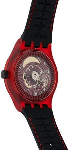 Red translucent plastic case with a black silicone strap. Fixed black plastic bezel. Black dial with black hands with dot hour markers. Dial Type: Analog. Luminescent hands. Date display at the 3 o'clock position. Automatic movement. Scratch resistant sapphire crystal. Pull / push crown. Transparent case back. Case diameter: 39 mm. Case thickness: 14 mm. Round case shape. Band width: 20 mm. Band length: 8.5 inches. Tang clasp. Water resistant at 30 meters / 100 feet. Functions: date, hour, minute, second. Casual watch style. Watch label: Swiss Made. Swatch Sistem Red Automatic Black Dial Black Silicone Unisex Watch SUTR400.Feature