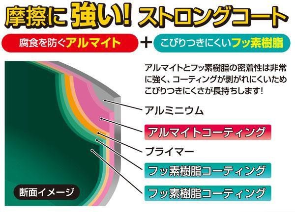 摩擦に強いストロングコートを施したいため鍋です。アルマイトとフッ素樹脂の密着性は非常に強く、コーティングが剥がれにくいため、こびりつきにくさが長持ちします。 |