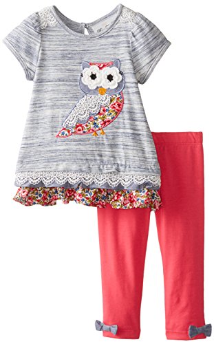 Blue slub knit top with owl applique to fuchsia knit legging