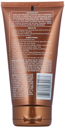 Treat yourself to an instant, streak-free tan with Sublime Bronze Tinted Self-Tanning Lotion in Medium Natural Tan. The tinted guide color provides an instant bronze glow with subtle shimmer while a streak-free sunless tan develops. Vitamin E and gentle AHAs* leave the skin feeling smooth and soft. Results may vary. Continue to use Sublime Bronze until you have reached your desired level of tan.*With alpha hydroxyl acid derivative.Feature