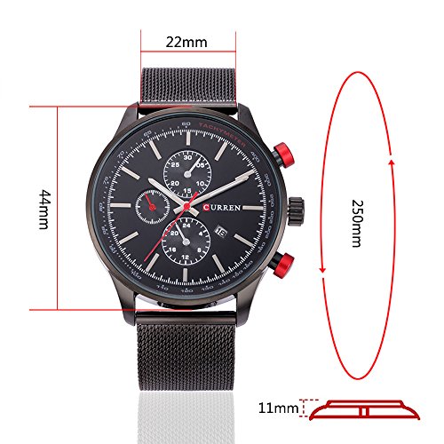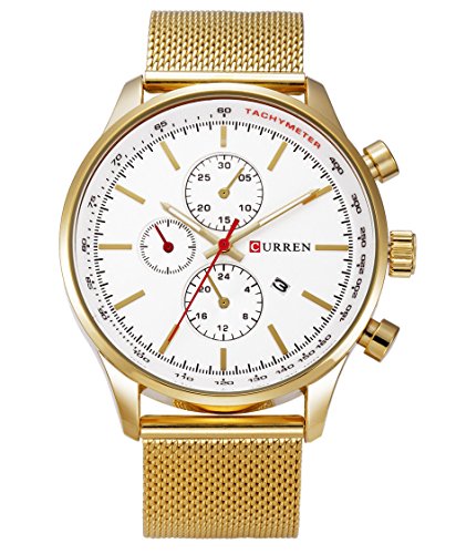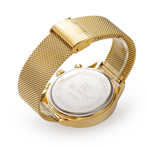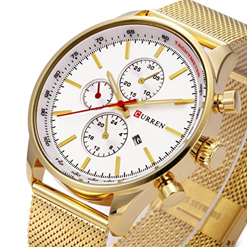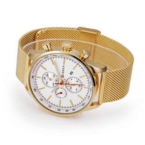 -. Feature : Quality stainless steel band design, durable and pratice, gives you a new classic definition. / Sport outlook, Alloy Case, Stainless Steel Back Case; Scratch resistant glass. / Gold-tone watch featuring round dial with stick hour markers / Three decocartion samll sub dials not working and one workable date calendar. / Living waterproof design (Not suitable for swimming, diving, shower etc)