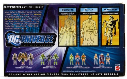 -. Binding : Toy -. Brand : Mattel -. EAN : 0027084696936 -. Feature : Long time collectors and newcomers alike will scramble to get their hands on these collectible figures / Bold colors and dramatic detail / Features your favorites along with a whole army of heroes and villains / For the first time, DC Comics figures will be offered in the 3-3/4 inch. scale / 3-Pack provides collectors a new scale to collect their favorite heroes and villains -. IsAdultProduct : 0 -. Label : Mattel -. Manufacturer : Mattel -. Model : N7211 -. ProductGroup : Toy -. ProductTypeName : TOYS_AND_GAMES -. Publisher : Mattel -. ReleaseDate : 2008-11-15 -. Studio : Mattel -. Title : DC Universise Infinite Heroes with Batman, Deadshot, Scarecrow Figures -. UPC : 027084696936 -. Warranty : N