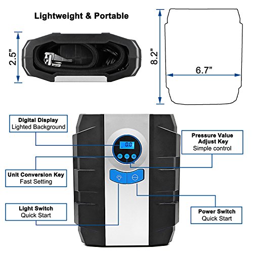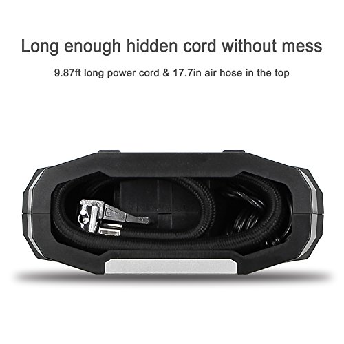 - ✅ PORTABLE AND LIGHTWEIGHT: Compact and small size, portable and lightweight; Its 9.87ft long power cord and 17.7 inch air hose with tangle-free organized design, allow to reach all tires and enables cord easy to put away with no mess or clutter.