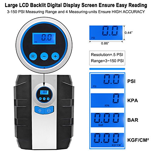 - ✅ PRECISION DIGITAL TIRE GAUGE: Built-in bright LCD backlit digital tire gauge with 0.86 x 0.44 inch display screen offers directly visual digital readout of tire pressure and avoid guesswork from analog dial. Measuring range: 0-150 PSI with precise accuracy of 0.5 PSI and four units to choose: PSI, BAR, KPA, KG/CM².
