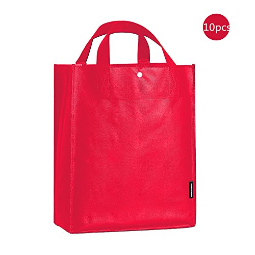 10 Packs of Grocery Bag Recycled Large Reinforced Shopping Tote with Snap Button, Red