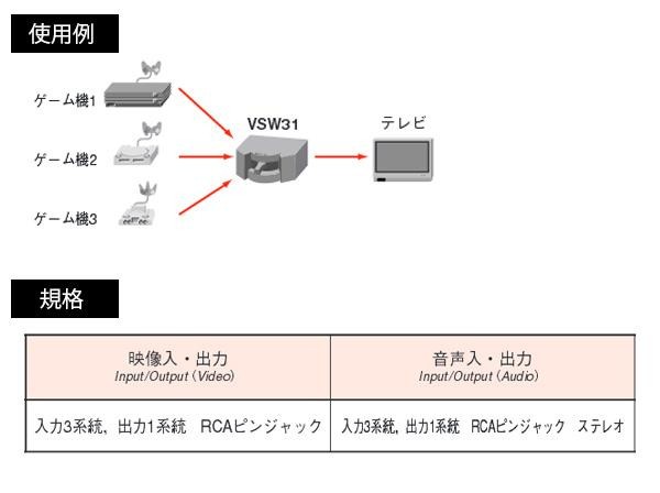 ゲーム機やビデオデッキ、DVDプレーヤーなど3つのAV機器からの入力信号をスイッチで切換えられる、電源を使わないタイプのAVセレクターです。 |