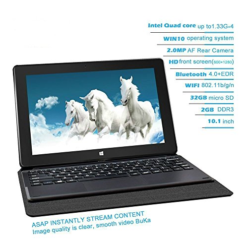 -. Feature : 2-in-1 tablet PC, not only a tablet, but a PC. Convenient enough as a tablet, powerful enough as a PC. / Stable and smooth surfing experience with Windows 10 operation system, Intel Baytrail CR Quad Core CPU, and Intel HD Graphic(Gen7) GPU / IPS 800*1280 screen, comparing to LED, offers you a bigger angle view, a wider color gamut, excellent for drawing, making pictures and watching videos etc. / 2GB RAM +32 GB Nand Flash extendable to 128GB with Micro SD Card, 7 hours battery life. And 1 TB OneDrive Cloud Storage added. / Our product is covered with one year limited warranty, please feel free to contact us for return or replacement if it is dead on arrival or the system itself doesn't funtion properly.