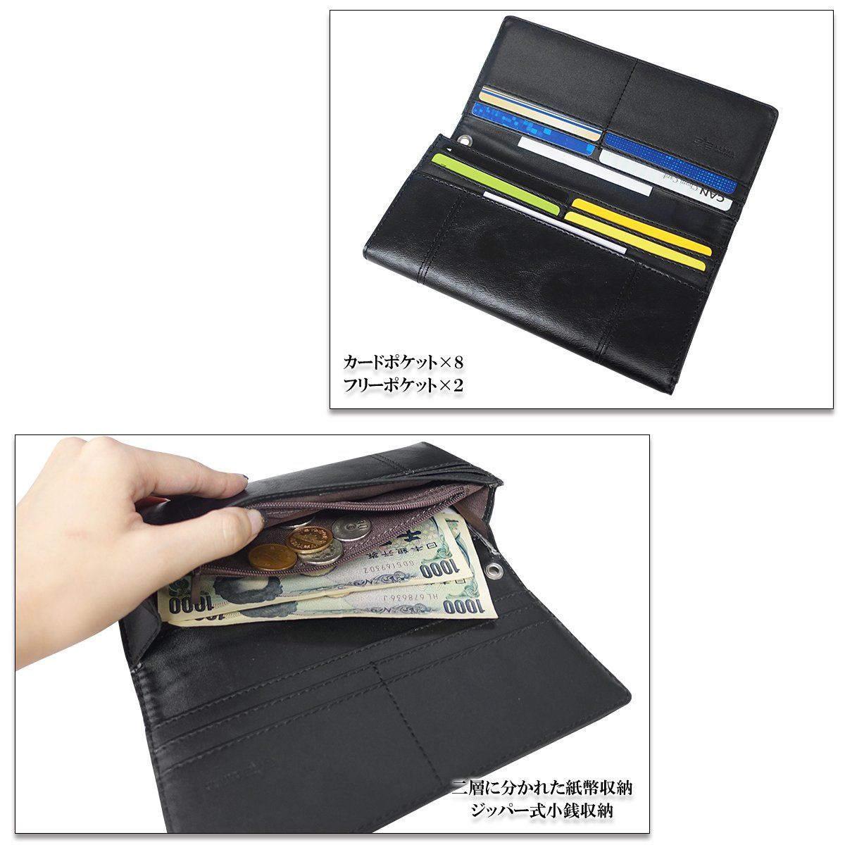 Between the banknote storage space divided into two layers, a coin purse that adopted the YKK zipper is provided.
