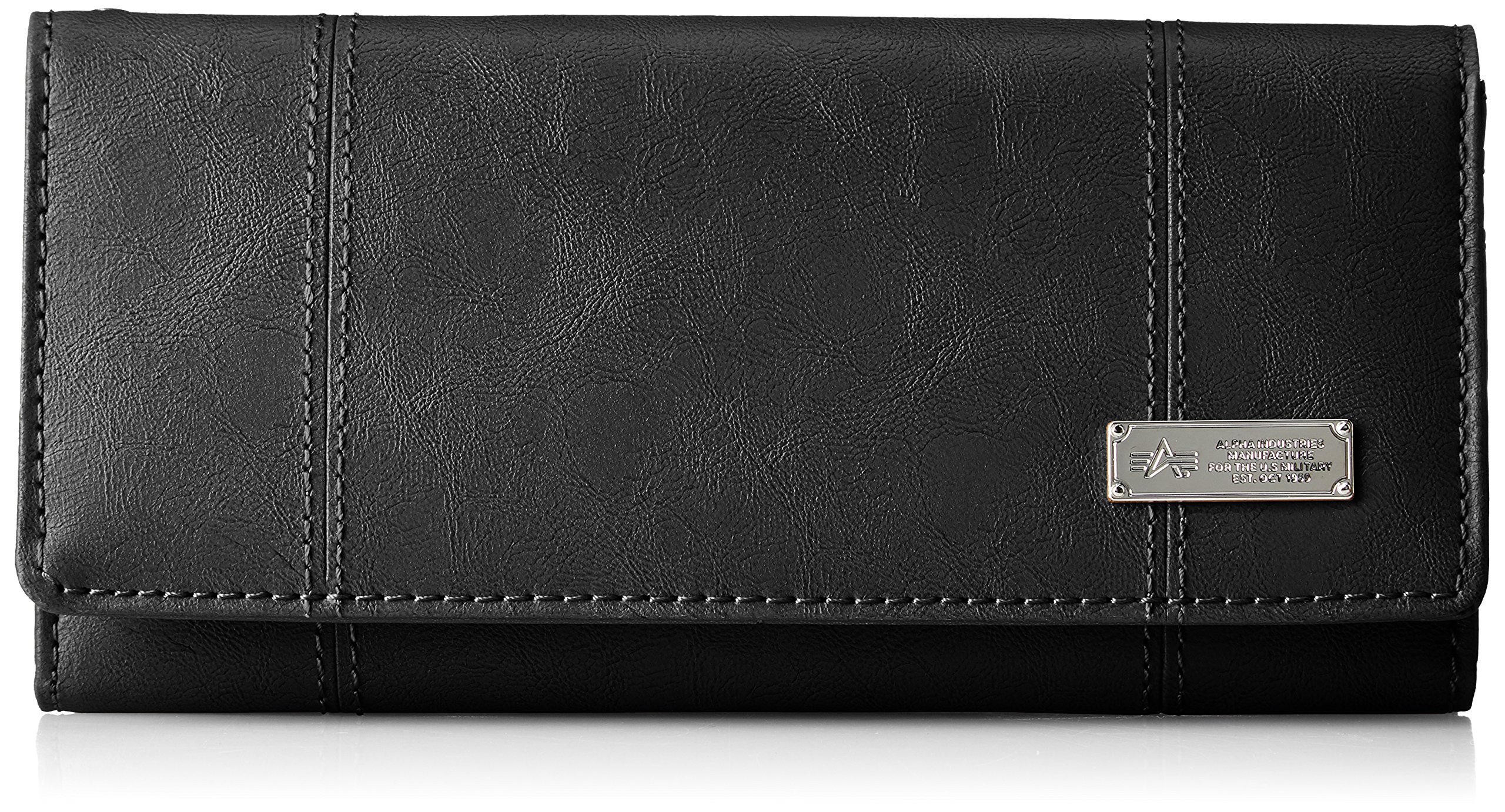 Silver metal plate engraved with a logo and a long wallet accented with a stitch line.
