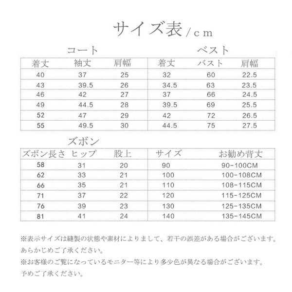 メイン素材:コットンセット内容:3点セット(ジャケット+ベスト+ズボン)サイズ:90 100 110 120 130 140しっかりとした厚みのあるコットン素材の男の子用フォーマルスーツです?七五三、お宮参り、入園式、卒園式、結婚式などのイベントに大活躍のセットです!サイズは、実寸を測っているため多少の誤差はございます。実商品とPC画面では、多少見た目の色に違いがございます。初期不良の場合、未使用の商品のみ到着日から7日以内にご連絡頂ければご返金、交換対応させて頂きます。●商品が到着しましたら、必ず中の商品を確認していただき、商品の到着後、3-4日間以内に必ず弊社までご連絡ください。★いかなる理由であってもご使用後の返品交換は承れません。