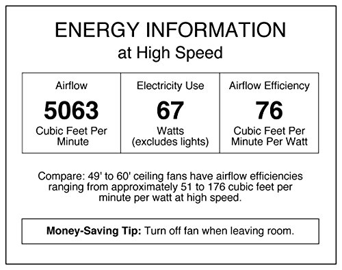 Airflow: 5063 CFM; Energy Usage: 67-Watt without lights; Airflow Efficiency: 76 CFM per-Watt